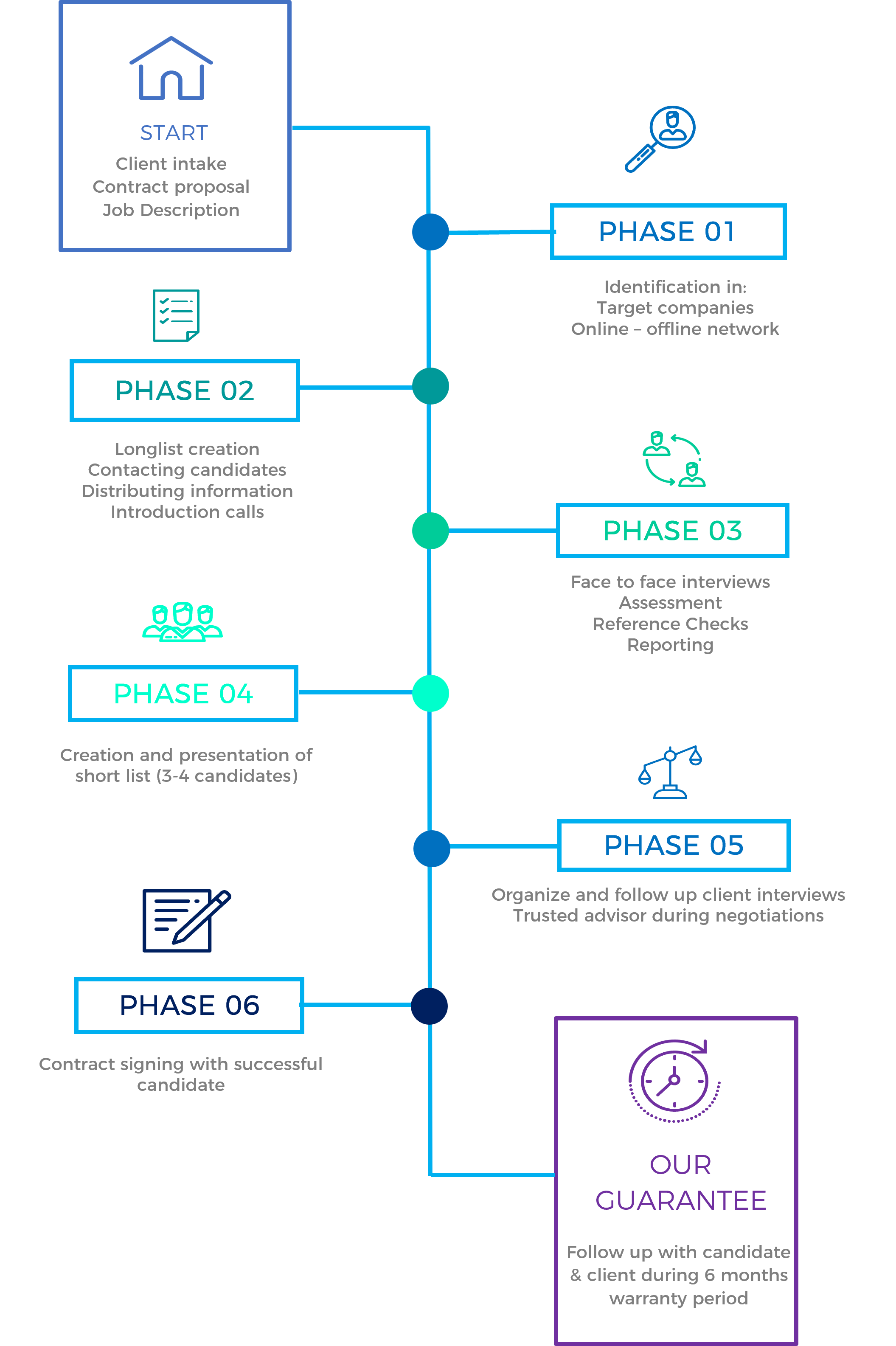 Our Retained Search Services are offered through a single point of contact to our Client companies. All interviews and assessments are performed by Partner level consultants. Upon being given the mandate to perform such a Search, we perform the following steps to ensure a satisfactory conclusion. We prepare a Position Description that will serve to enter into discussions with target candidates